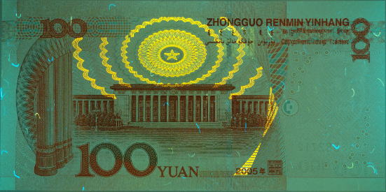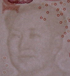 | 人民元(新デザインのみ)には表裏ともに、1面だけでは意味を成さない模様(または符号)が印刷されている。右の写真にみられる赤い円と半円状の受話器に似たマークがそれだ。 |