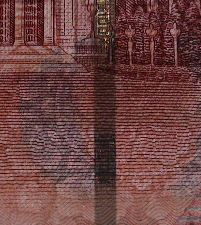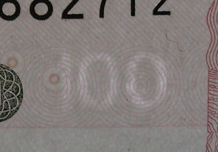 | 真正券ではこの部分を透過光でみた場合、表裏の赤い円と半円状マークがピタリと重合し、真円状になるよう位置が決められており、正確に印刷されている。 |