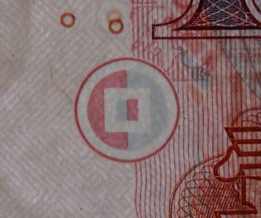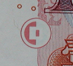 | 紙幣の右下には、いわゆる識別マークが、深い凹版印刷で印刷されている。真正券では紙の表面に対し、相当にインクが盛り上がって印刷されている。このため指の触感で金種が判断できる。本来識別マークは目の不自由な人のために考えられた印刷であるが、偽造対策としても有効で一石二鳥といった感のある対策である。鑑定方法としては斜光線による拡大鑑定をおすすめしたい。 |