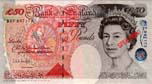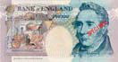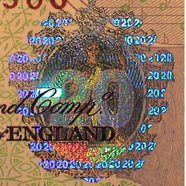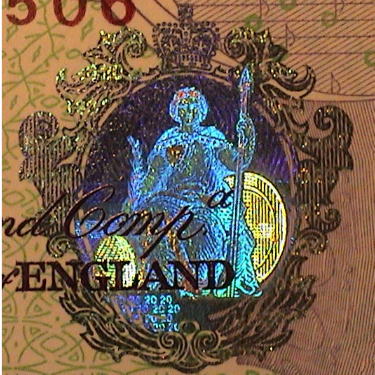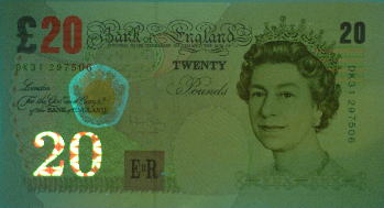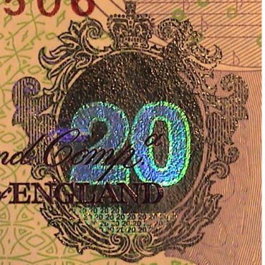 英ポンド紙幣に施されているフォログラムは右写真のように3つの画像を表現する。すなわち金種マーク「20」、次にやや小さい文字で同じく金種の「202020〜」の連鎖印刷、さらに、人がつえのような棒状のものを持ち、腰掛けている画像である。
