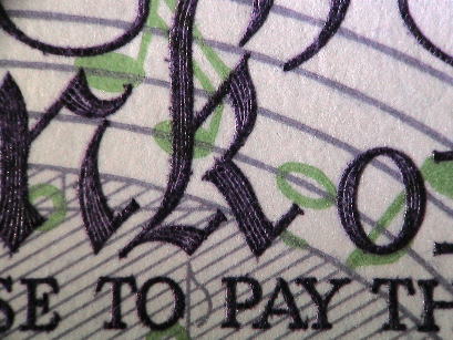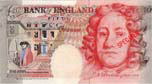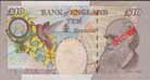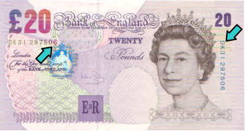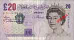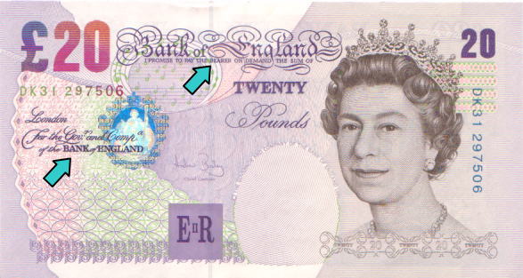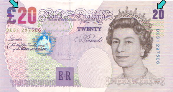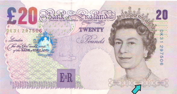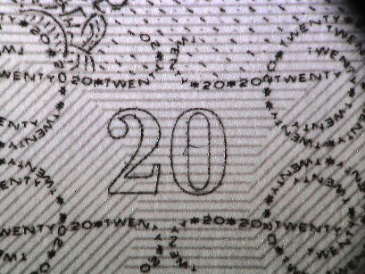 | 表面左上部には「£ 20」の表記が見られる。太い線と細い線が交互にあり文字のかたちをあらわしている。カラーコピーなどの偽造券ではこのような微細が画線が集まる部分は色分解の段階で画線が寄りつき、いわゆるベタ塗抹状の印刷になりがちである。 |