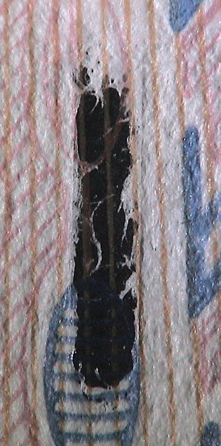 | 窓開きセキュリティースレッドの場合、偽造が容易なためか、紙の上から銀紙状のシールを貼り再現された例が散見される。真正券のセキュリティースレッドは右写真のように、用紙の中に存在している。 |