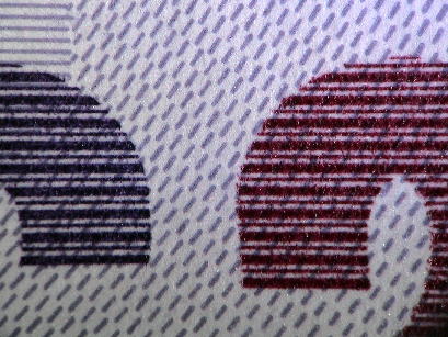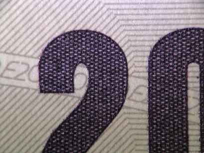 | 表面左上部にも金種マーク「20」に微細並行集合線が見られるが、こちらは並行線がクロスし、より細密な印刷となっている。 |