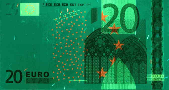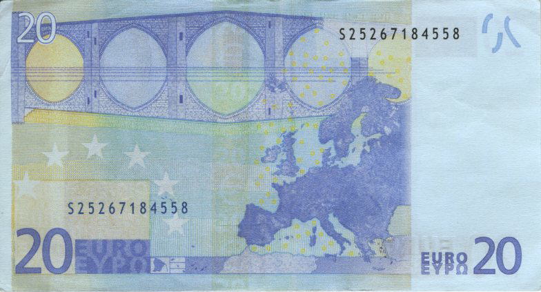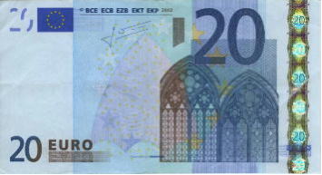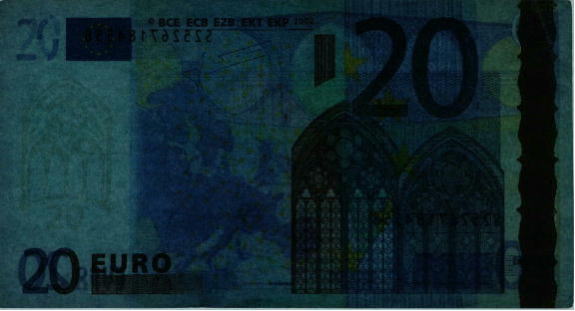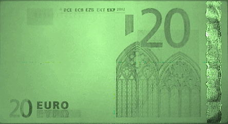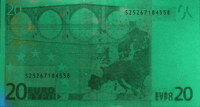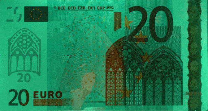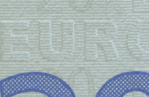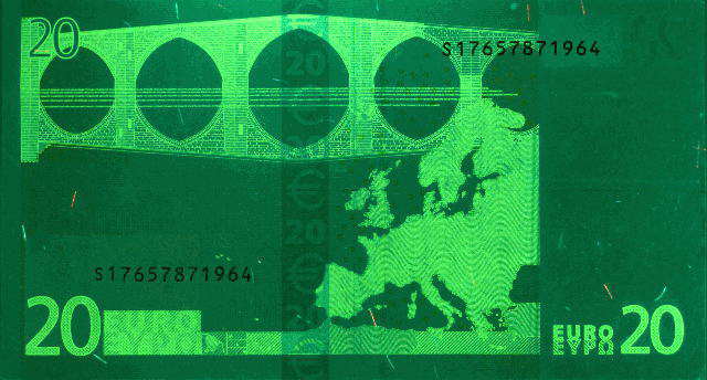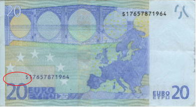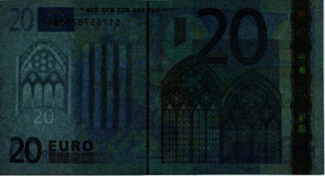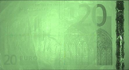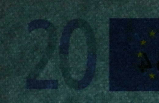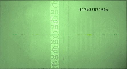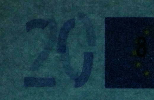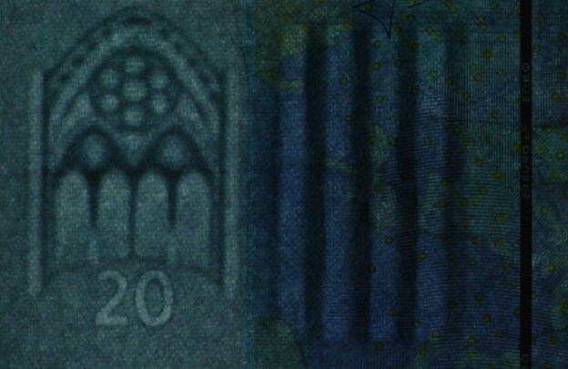 真正券では、中央縦方向にユーロマークと20の文字が見受けられる。いわゆるパールインクによる印刷で、傾けると真珠のような光沢が見受けられる。 |