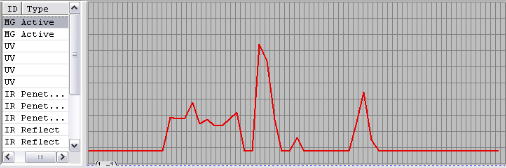 真正券では磁性インクが使用されているため、印刷画像なりに磁気反応を生じ、右図のような山谷(やまたに)パターンができる。 |