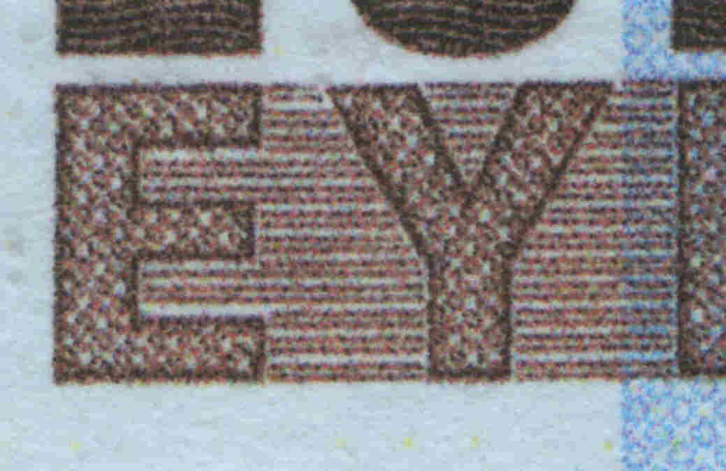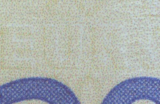 偽造券ではホログラムの解析がほとんど見られないため、マイクロ文字「EYPΩ」や「20」の文字の重ね印刷は見受けられない。 |