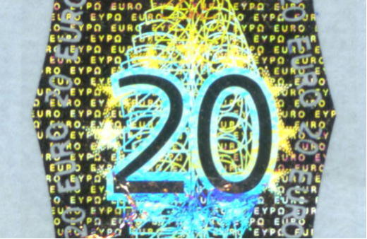 真正券ではホログラム内にはマイクロ文字「EYPΩ」が連記されている。「20」の文字は大きさを変え重ねて印刷されている。 |