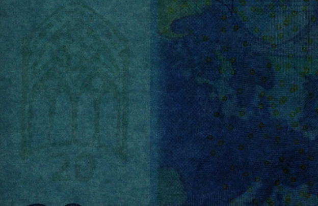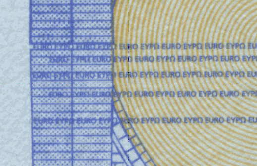 裏面にデザインされた橋の橋脚部分には水面をイメージした横線に約200ミクロンの大きさのマイクロ文字「EURO EYPΩ」が隠されている。