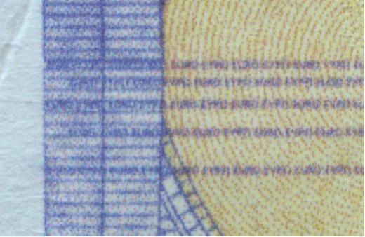 真正券ではギリシャ文字「EYPΩ」の中に20を連記したマイクロ文字(右上がりに傾斜)が印刷されている。