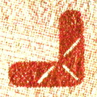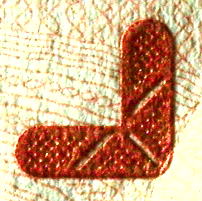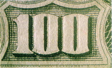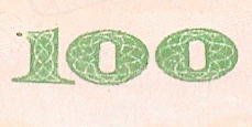 紙幣の右下には、いわゆる識別マークが、深い凹版印刷で印刷されている。真正券では紙の表面に対し、相当にインクが盛り上がって印刷されている。このため指の触感で金種が判断できる。本来識別マークは目の不自由な人のために考えられた印刷であるが、偽造対策としても有効で一石二鳥といった感のある対策である。鑑定方法としては斜光線による拡大鑑定をおすすめしたい。 |