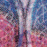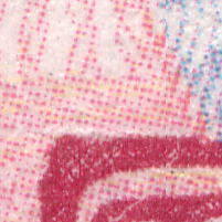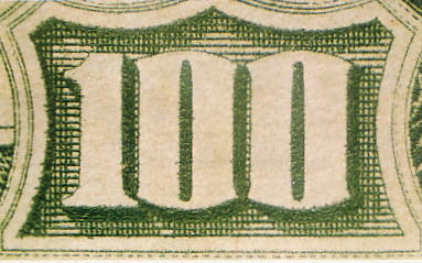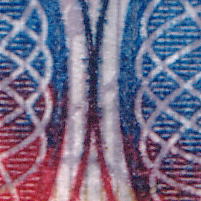 偽造券では地紋模様は網点印刷、すなわち真正券が「線」であるのに対し、偽造券は「点」の集合で線を表していると言えよう。印刷版式の差異が出来映えの差異として現れた例である。