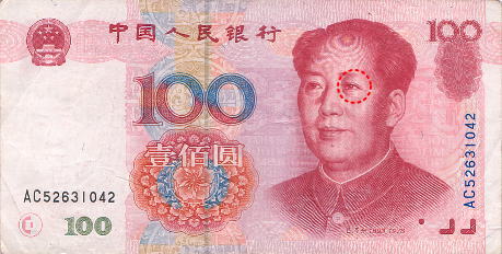 ただし、偽造米ドルなどでは凹版印刷の特徴を擬似的に再現する意味で、いわゆるエンボス痕を施し、触感を誤認させようとする例もあり、今後、人民元にもそのような新手の偽造券が現れる可能性があることを指摘したい。 |