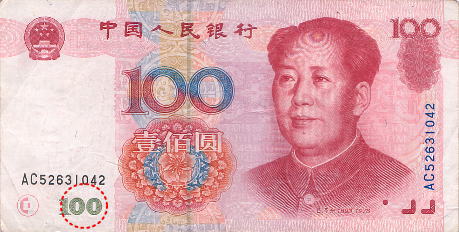 真正券の記番号の印刷には微弱な磁性インクが使用されている。画像的な差異はないが、磁気センサーに反応するため、鑑定装置などはこのポイントを鑑定要素に採り入れている例が多い。当該人民元はこの紙幣記番号以外はすべて非磁性インクで印刷されている。 |