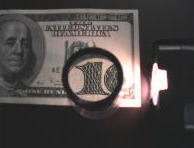 米ドル紙幣など多くの通貨では磁性インクにより印刷されている。磁気の有無は、右図のような軽便な磁気センサーで鑑定が可能である。 |