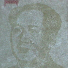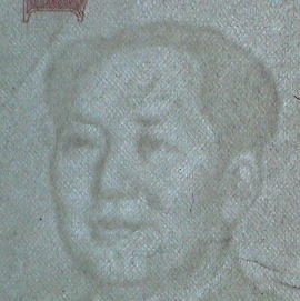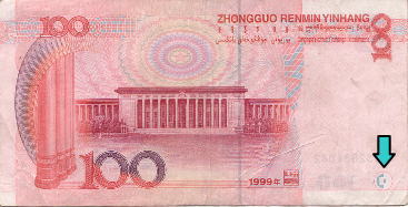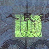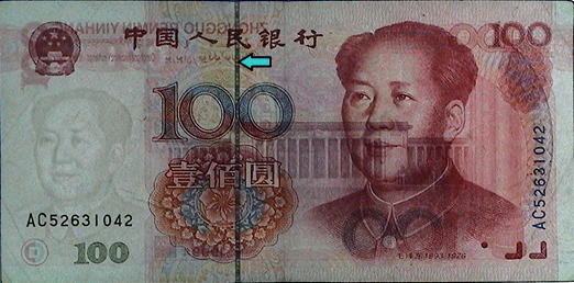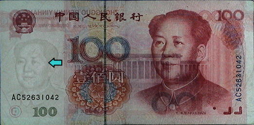 人民元(新デザインのみ)には表裏ともに、1面だけでは意味を成さない模様(または符号)が印刷されている。右の写真にみられる赤い円と半円状の受話器に似たマークがそれだ。 |