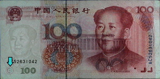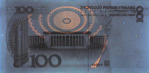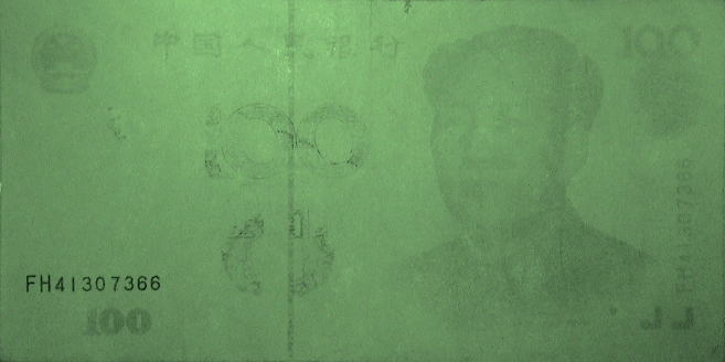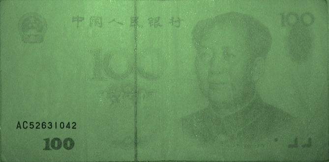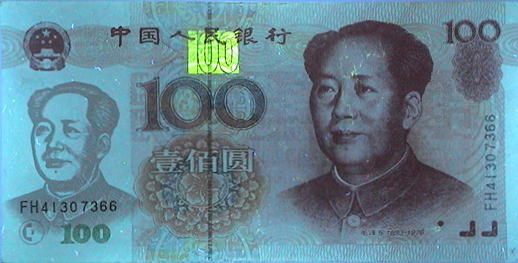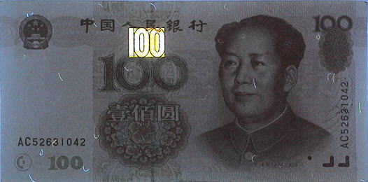 赤外線吸収あるいは透過インクによる施工は先進の偽造対策であるが、人民元においても記番号とシフティング・カラード・インク以外を透過する性質を持っている。 |