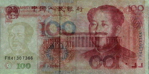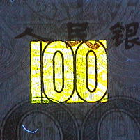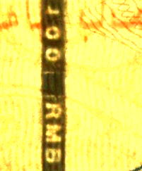 真正券では用紙中に約1mm幅の帯状金属泊が埋め込まれ、いわゆる抜き文字で「100 RMB」の文言が上下、表裏に反転しながら連続印刷されている。 |