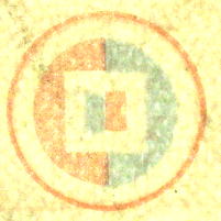 真正券ではこの部分を透過光でみた場合、表裏の赤い円と半円状マークがピタリと重合し、真円状になるよう位置が決められており、正確に印刷されている。 |