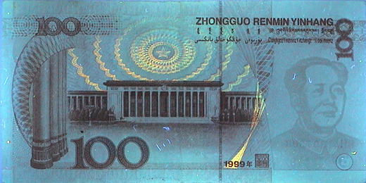 赤外線については偽造券も真正券とほぼ同様の反応を示す。同仕様の結果が意図的なものか、偶発的なものか伺い知れないが、100元は全体的に赤インクで印刷されていることから偶然の結果と思料される。 |
