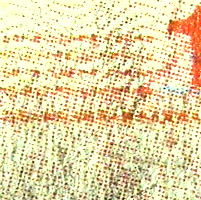 真正券に紫外線、いわゆるブラックライトを照射する。金種マーク「100」が橙色に、無数のオプティカルフィラメント(光学繊維)が黄色と青色に蛍光発光する。なお、オプティカルフィラメントは自然光では無色であるため、視認できない。 |