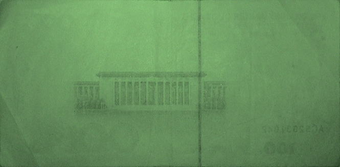 偽造券では用紙そのものが青白く蛍光発光している。金種マーク「100」は不鮮明な黄緑色に蛍光発光し、オプティカルフィラメントは青色発光するもの極わずかに見受けられ、真正券との差異が際だっている。 |