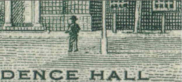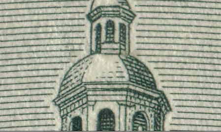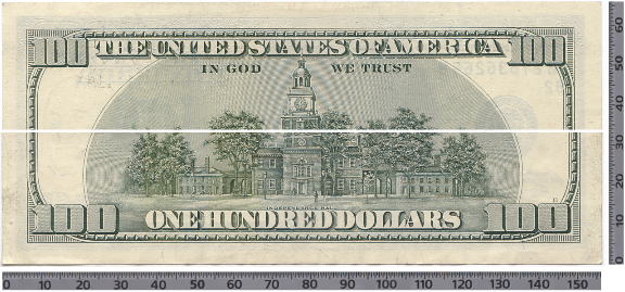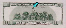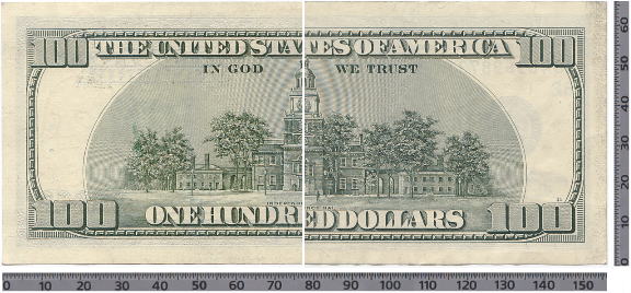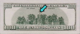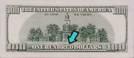 | 裏面中央下部にある「INDEPENDENCE HALL」の最後の「L」字は真正券では前の「L」より文字高がやや小さい。 |