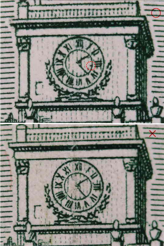 また、真正券では3時を表す「V」字 の左に時計盤内側の円に接して小さな点