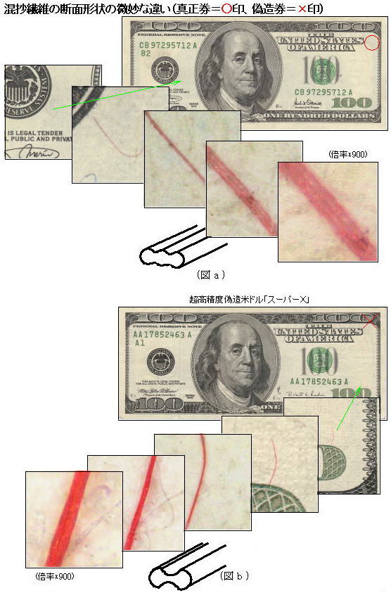 米ドル紙幣には用紙の偽造防止対策として赤と青の微細な繊維を抄き込んでいる。真正券ではナイロン繊維が使用され、その断面図は図(a)のようになっている。化学繊維の場合は精製の過程で繊維射出機が使用されるが、糸の断面形状は射出孔のあなの形状と同じになるため、特定の形状を有することが、微細であるだけに有効な偽造対策になるわけで
