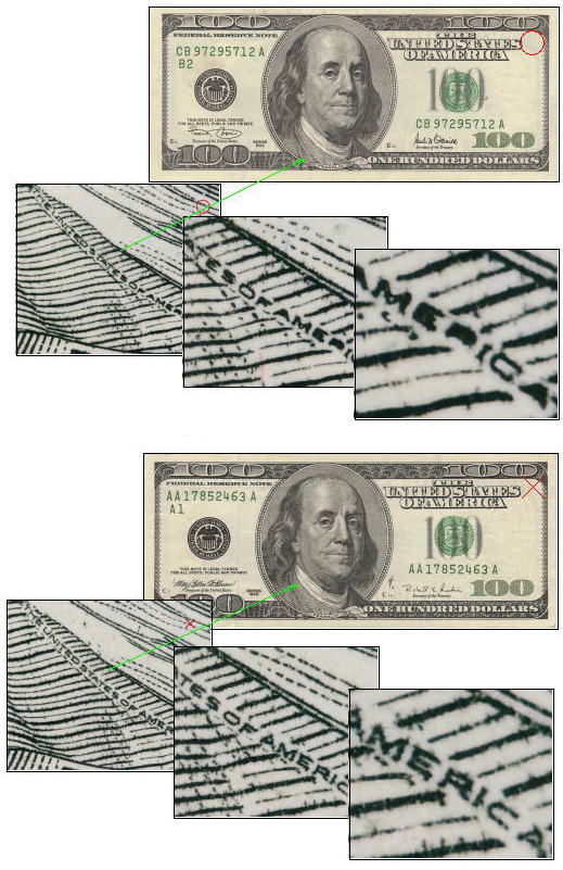 むしろ解像度においては、まるで偽造券の方が精度が高いぞと言わんばかりに見えてくる。その点が大いに驚異である。 |