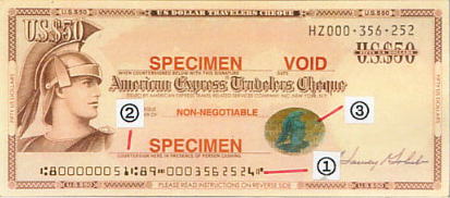 米ドル旅行小切手の多くはMICR(MAGNETICINK CHARACTER RECOGNITION)部分@にE13B方式を採用している。一般的にこの様な磁性インクによる印刷はコスト高となるため、過去に発見された偽造旅行小切手の大半は非磁性インクで印刷されている。