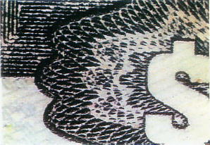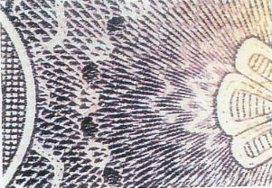 一般的にこの様な磁性インクによる印刷はコスト高となるため、過去に発見された偽造旅行小切手の大半は非磁性インクで印刷されている。また随所に凹版印刷の特徴であるインタグリオ(インクの盛上リ)がみられる。さらにシグネィチャー欄のアンダーラインAは文字サイズ190ミクロンのマイクロ文字によって描かれている。 |