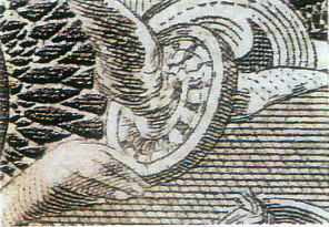 また随所に凹版印刷の特徴であるインタグリオ(インクの盛上り)がみられる。さらに左端に地球儀、右端には鳥のすかしが施されており、透過光による重合視認鑑定が可能なようになっている。 |