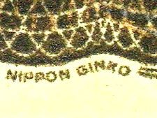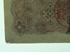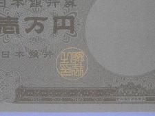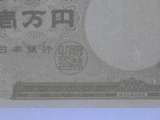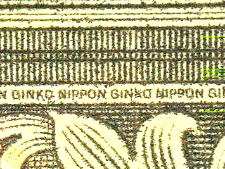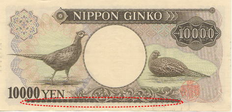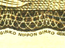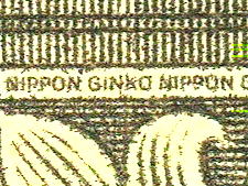 真正券ではマイクロ文字「NIPPONN GINKO」が連続印刷されている。偽造券においては何やらとぎれがちな点線状の印刷が見られるが、文字と視認できない。「原版」をもたないカラープリンターなどの簡便な印刷では、マイクロ文字の再現は不可能である。 |