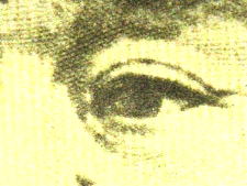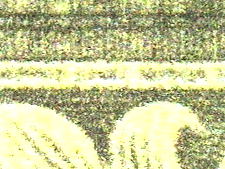 当然ながら、真正券の非印刷面にインクは見られない。対して偽造券では赤、青、黄(印刷面には黒あり)の3色が、カラープリンターの出力と思われる微細な点状に印刷され、いわゆる生成りの色を再現している。 |